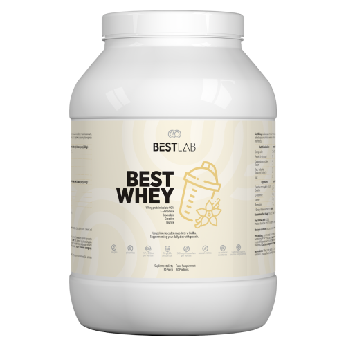 Best Lab BestWhey odżywka białkowa smak waniliowy 900 g to wysokiej jakości suplement diety, stworzony z myślą o osobach aktywnych, poszukujących smacznego i wartościowego źródła białka. Każda porcja dostarcza 21 g białka, a także kreatynę, l-glutaminę, taurynę i bromelainę – enzym pochodzenia roślinnego. Waniliowy smak sprawia, że przygotowany napój jest przyjemny w spożyciu i może być świetnym uzupełnieniem codziennej diety.